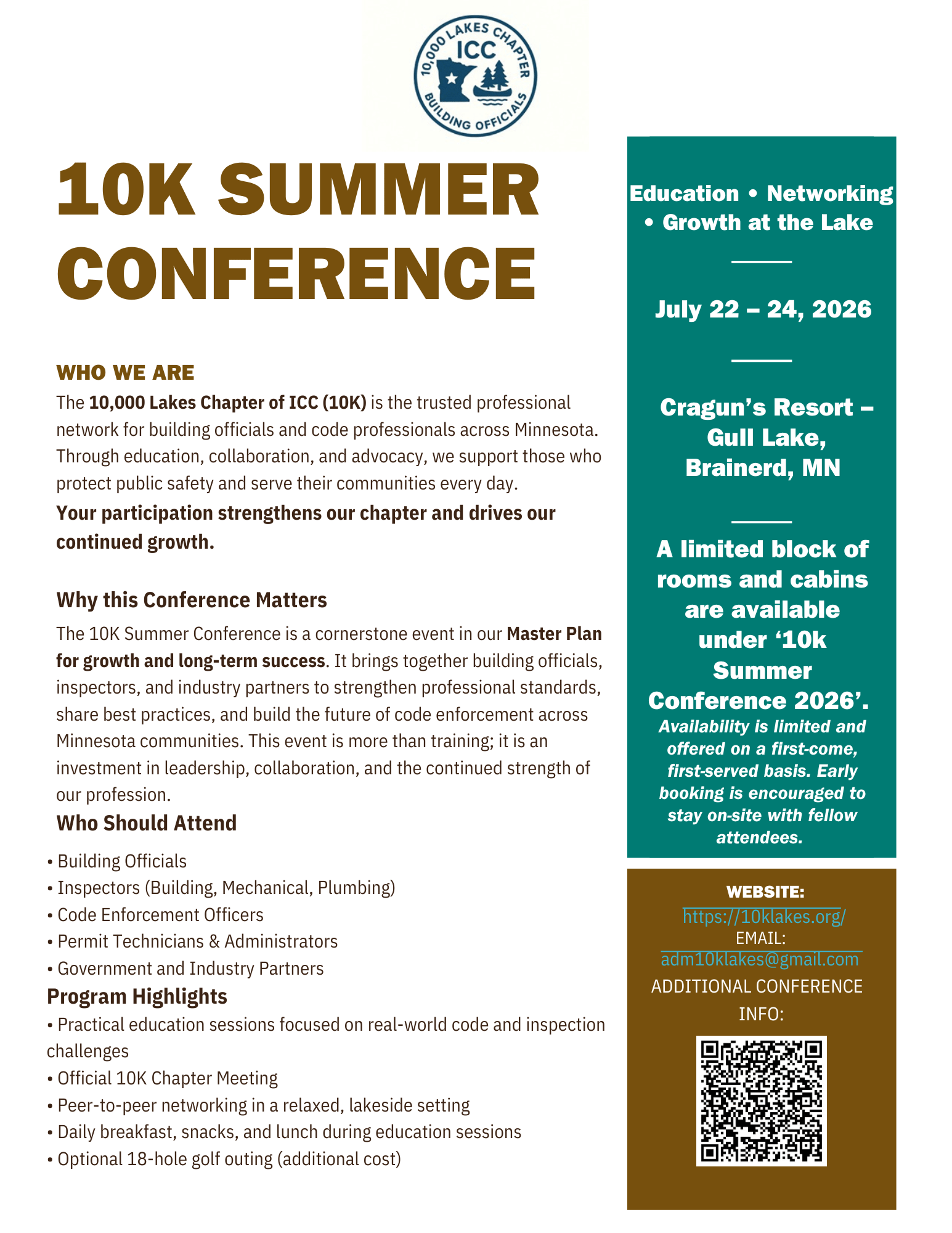 The 10K Summer Conference is a cornerstone event in our Master Plan for growth and long-term success. It brings together building officials, inspectors, and industry partners to strengthen professional standards, share best practices, and build the future of code enforcement across Minnesota communities. This event is more than training; it is an investment in leadership, collaboration, and the continued strength of our profession.